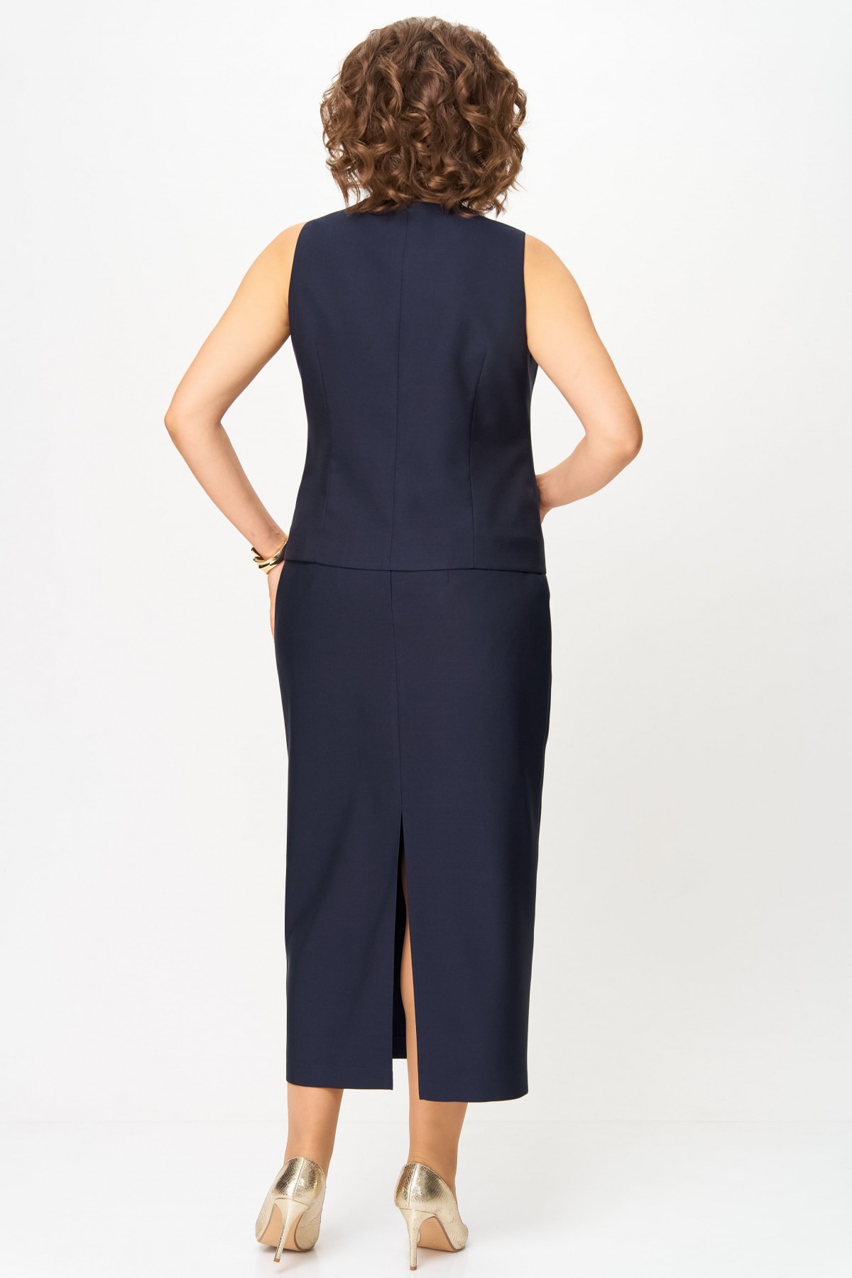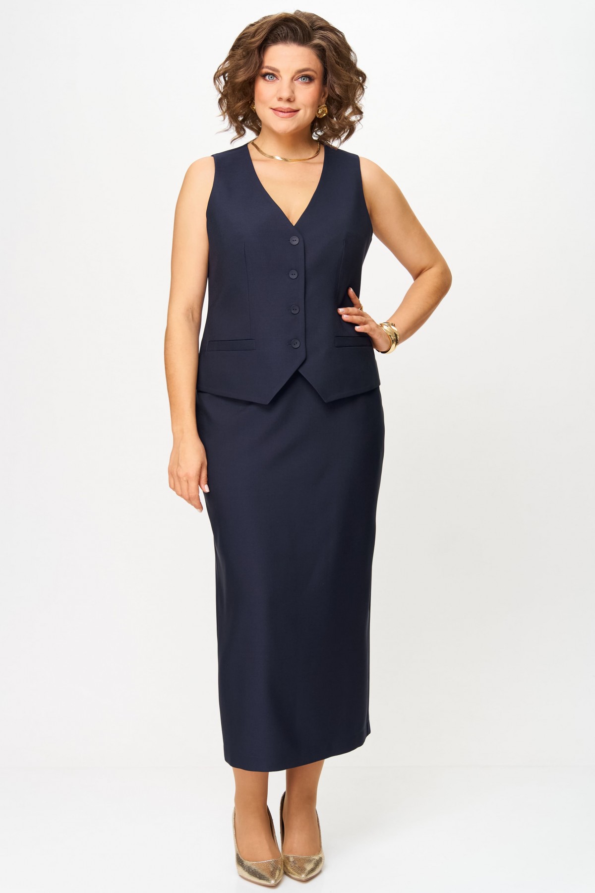 Жилет прилегающего силуэта с центральной бортовой застежкой на петли и пуговицы, на подкладке. Вырез горловины V-образной формы. Перед — с талиевыми вытачками и прорезными карманами с листочкой. Спинка со средним швом и талиевыми вытачками.