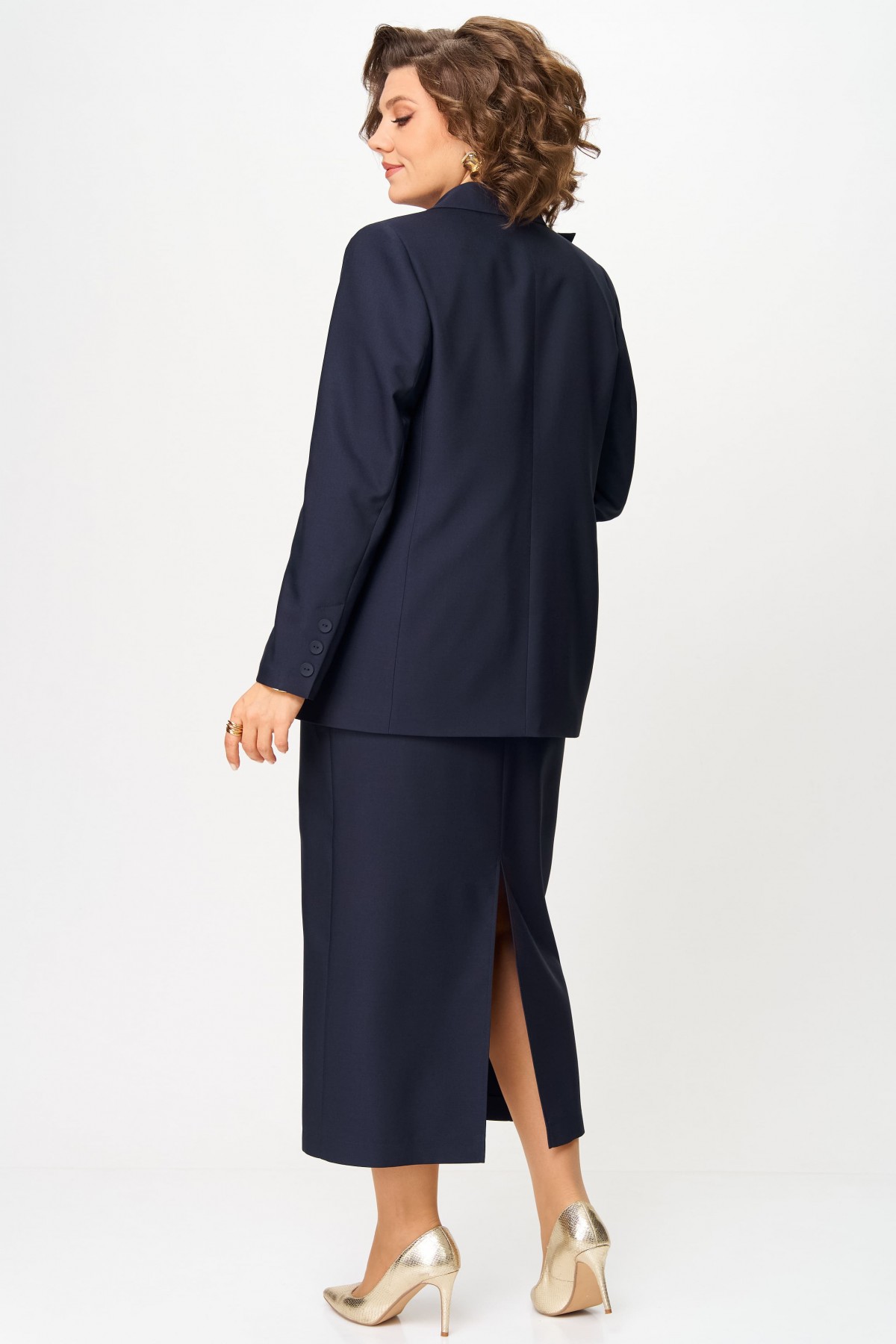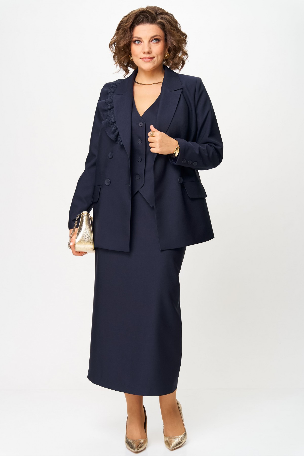 Жакет прямого силуэта, на подкладке, с плечевыми накладками. По переду — центральная двубортная застежка на петли и пуговицы, нагрудные вытачки и функциональные прорезные карманы с клапаном. Полочку жакета украшает съемная (на пуговицах) декоративная рюша с кружевом. Спинка со средним швом. Рукав втачной длинный двухшовный, с имитацией шлицы, декорированной пуговицами.