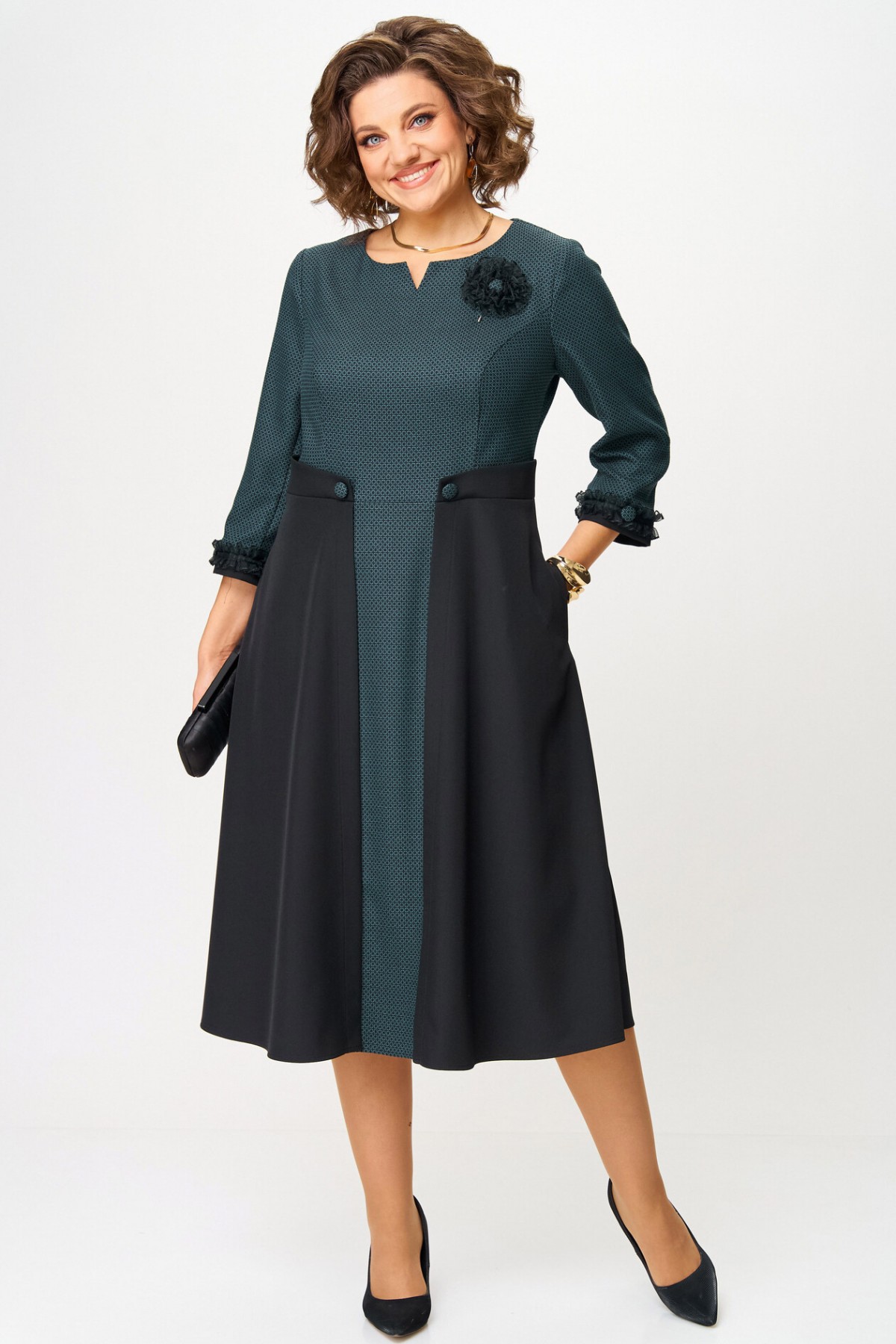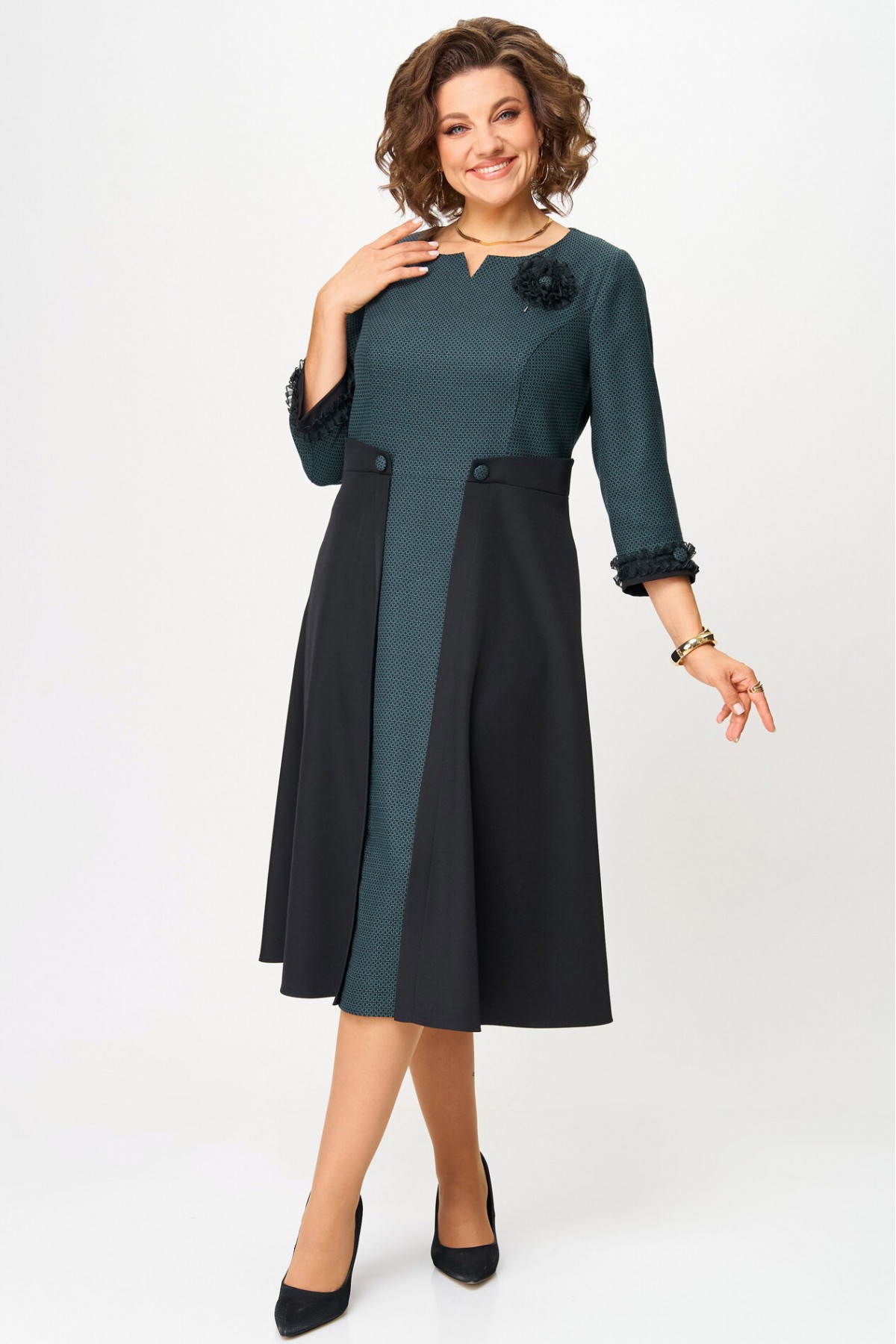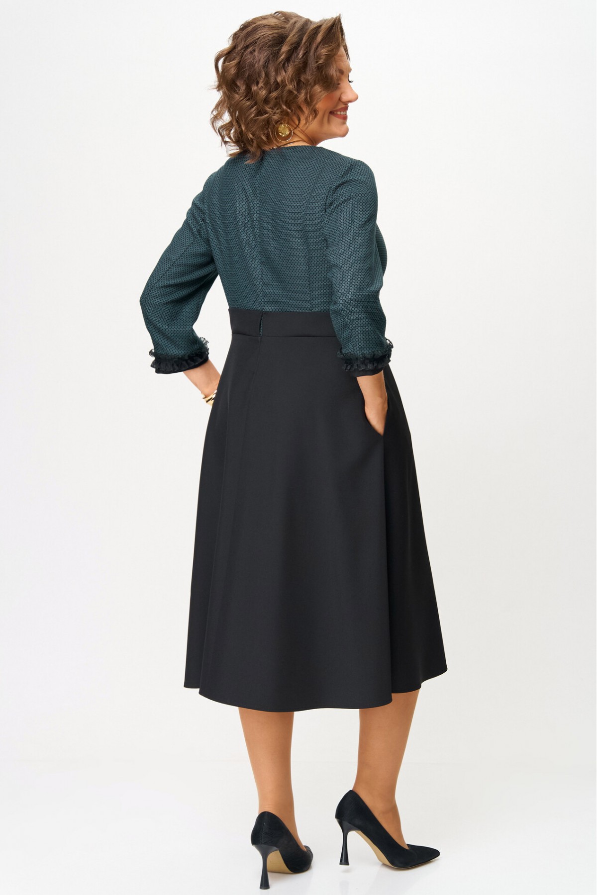 Платье полуприлегающего силуэта, отрезное по линии талии. Горловина с фигурным вырезом, обработана обтачкой. По переду лифа — рельефные швы. По спинке лифа талиевые вытачки и средний шов, в котором обработана потайная молния. Юбка платья "клеш", с вертикальной вставкой по переду и средним швом по спинке. Подрез по талии закрывается декоративным поясом с пуговицами. Добавят комфорта при носке функциональные карманы в боковых швах. Рукав втачной прямой, длиной ¾, по низу — манжет, декорированный тесьмой и пуговицей. В комплекте к платью прилагается съемное украшение из тесьмы.