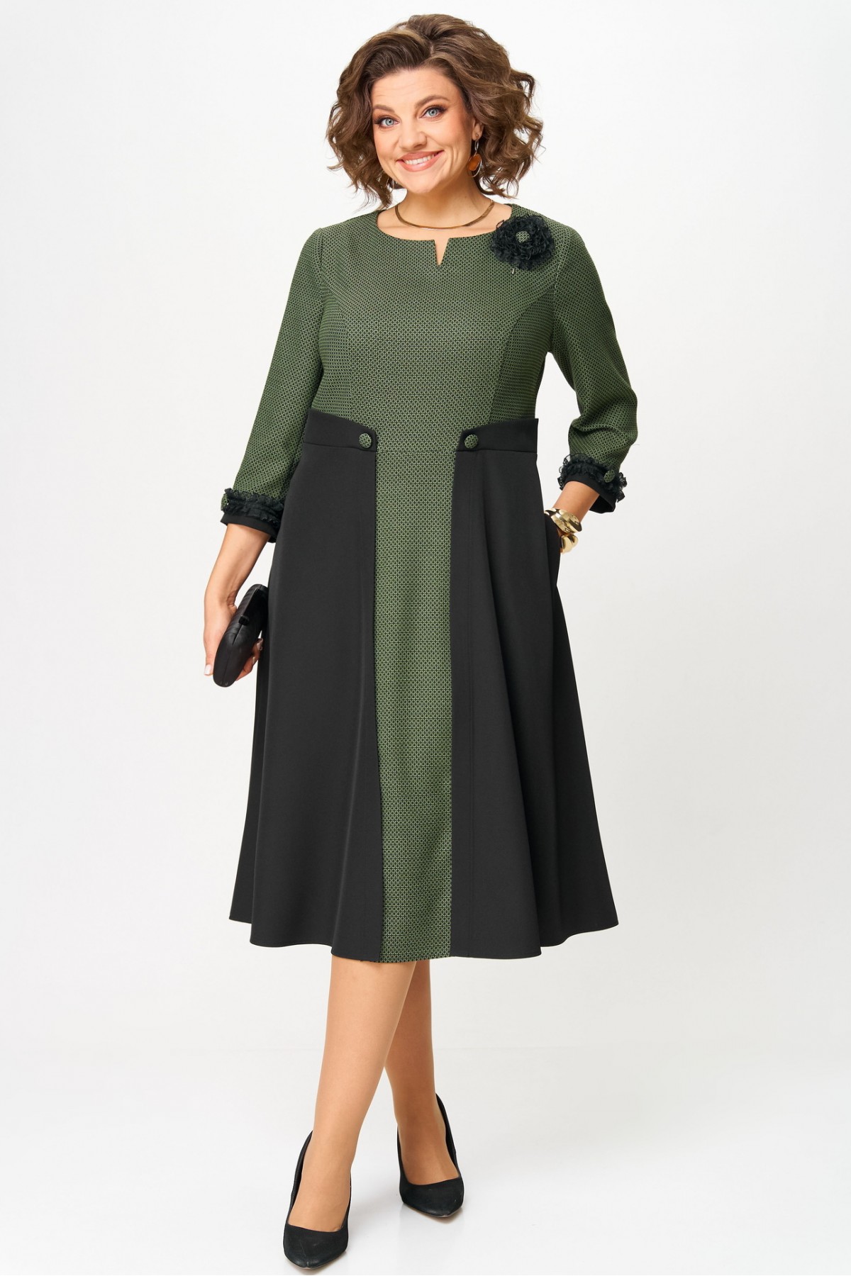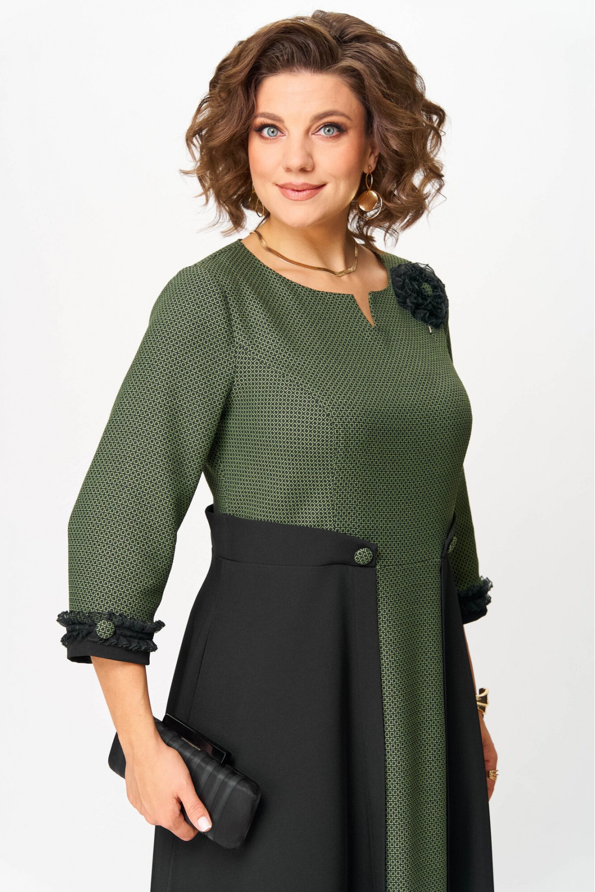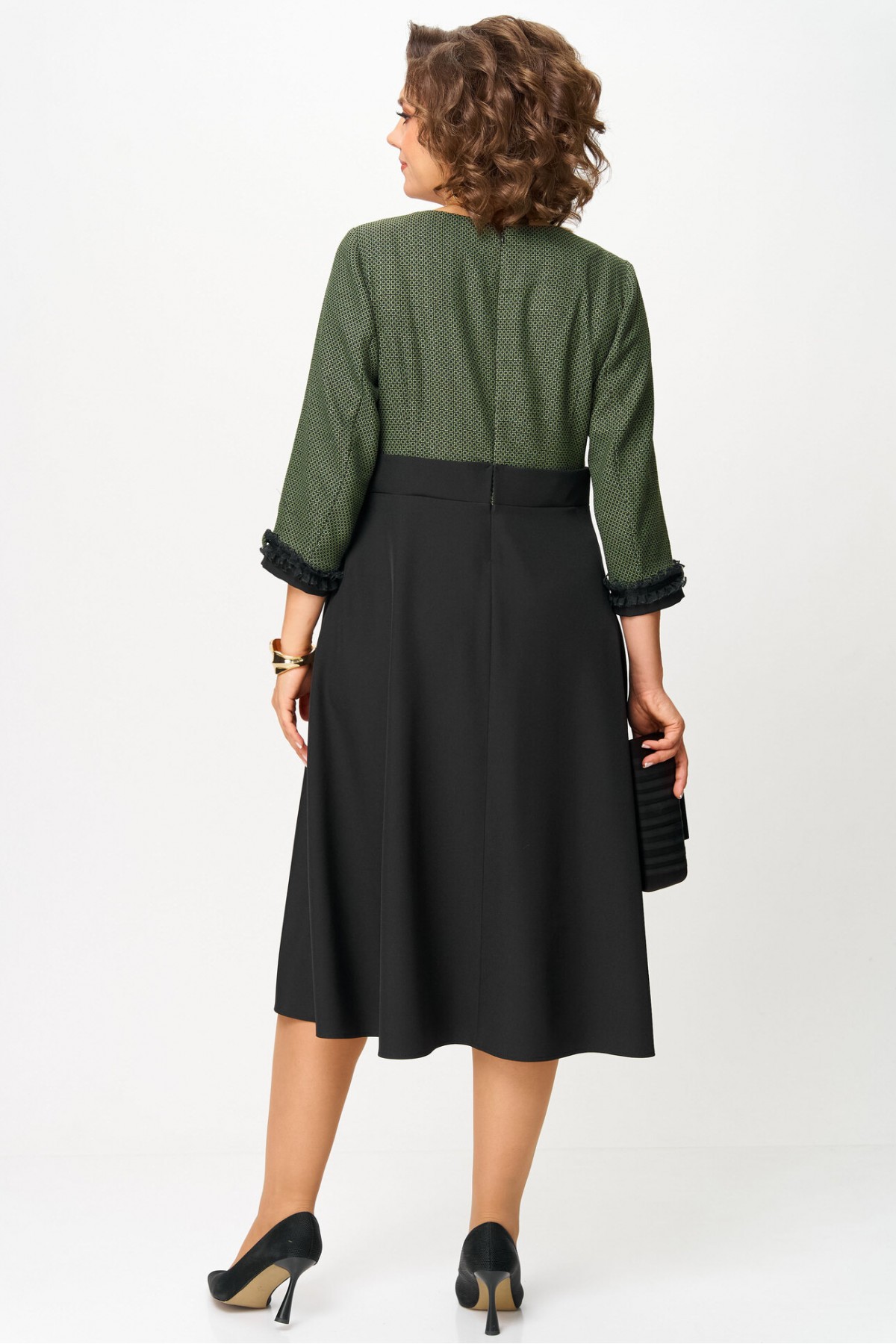 Платье полуприлегающего силуэта, отрезное по линии талии. Горловина с фигурным вырезом, обработана обтачкой. По переду лифа — рельефные швы. По спинке лифа талиевые вытачки и средний шов, в котором обработана потайная молния. Юбка платья "клеш", с вертикальной вставкой по переду и средним швом по спинке. Подрез по талии закрывается декоративным поясом с пуговицами. Добавят комфорта при носке функциональные карманы в боковых швах. Рукав втачной прямой, длиной ¾, по низу — манжет, декорированный тесьмой и пуговицей. В комплекте к платью прилагается съемное украшение из тесьмы.
